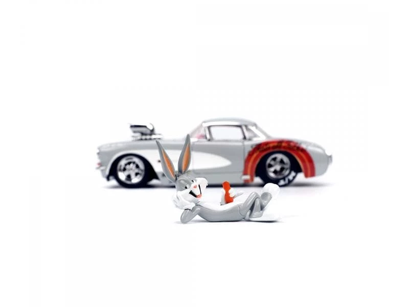 Bugs Bunny hat diese 1956er Chevy Corvette inspiriert und Sie können ihn nun in Ihre Sammlung aufnehmen. Dieses Die-Cast-Fahrzeug wurde für Bugs gemacht, da die glatte weisse Seitenwand seinen pelzigen weissen Bauch nachahmt. Logos und Aufkleber zieren das Fahrzeug und die Reifen. Das Fahrzeug wurde aus hochwertigem, schwerem Metalldruckguss gefertigt und verfügt über funktionierende Räder, hochwertige Gummireifen, eine zu öffnende Motorhaube, Türen und einen Kofferraum sowie eine zu 100% aus Zinkdruckguss gefertigte Bugs Bunny-Figur.