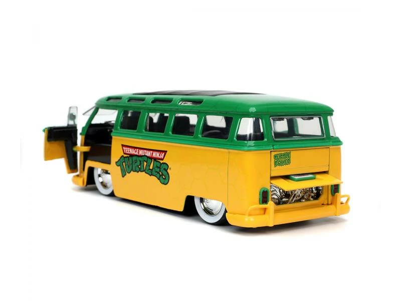 Mit Styling-Elementen, die von den Helden mit Panzern, den Teenage Mutant Ninja Turtles, inspiriert sind, verfügt dieser Volkswagen Bus von 1962 über Fenster, Türen und einen hinteren Motorraum zum Öffnen. Dieses Fahrzeug enthält auch eine ca. 7 cm grosse Leonardo die-cast Sammelfigur und ist sicher, ein Standout in jeder Fahrzeugsammlung sein.