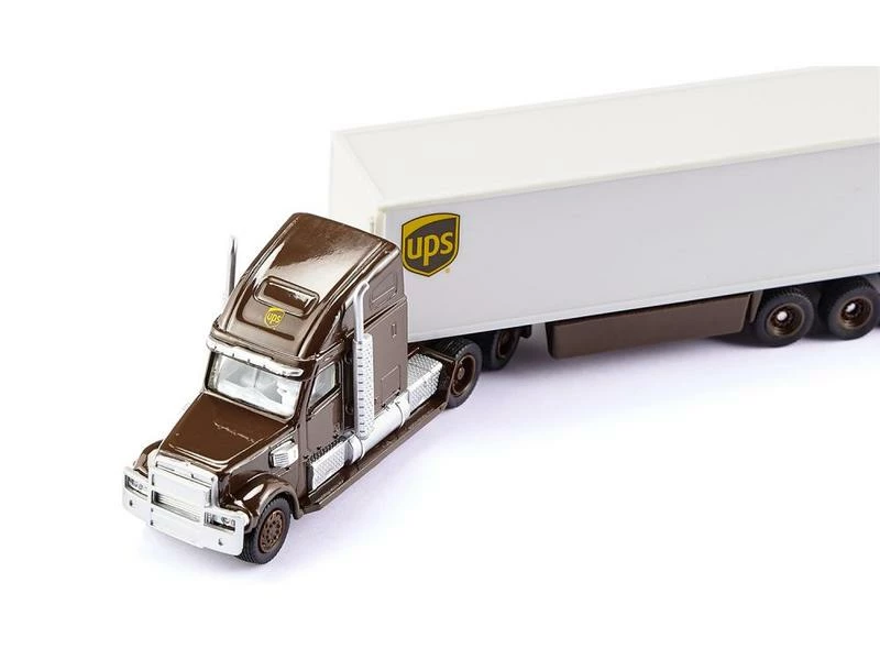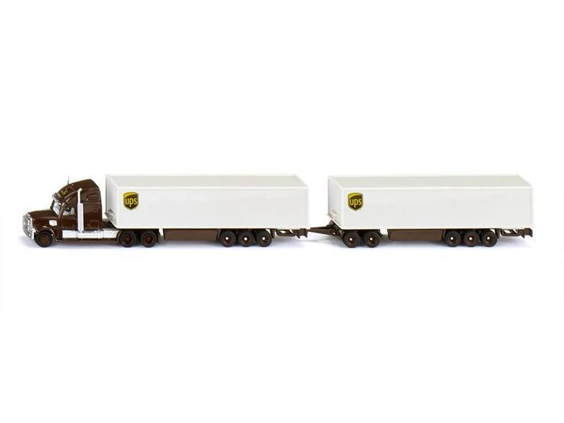 Der Road-Train ist ein mächtiges 30-Meter Gespann, 87-fach auf SIKU-Spielgrösse miniaturisiert. Die imposante US-Hauber-Zugmaschine ist mit Chromteilen verziert und zieht zwei mit einem Dolly verbundene 3-achs-Kofferauflieger über die einsamen Highways. Mit den 22 Rädern mit gummierten Reifen sorgt der Lastwagen für ruhigen Lauf auf jedem Untergrund.